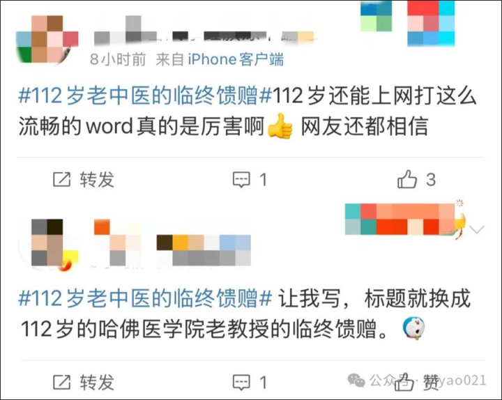 其实,也有明眼的网友看出了其中端倪。有网友评价“让我写,标题就换成112岁的哈佛医学院老教授的临终馈赠”,还有网友揶揄“112岁还能上网打那么流畅的word真的是厉害啊”……