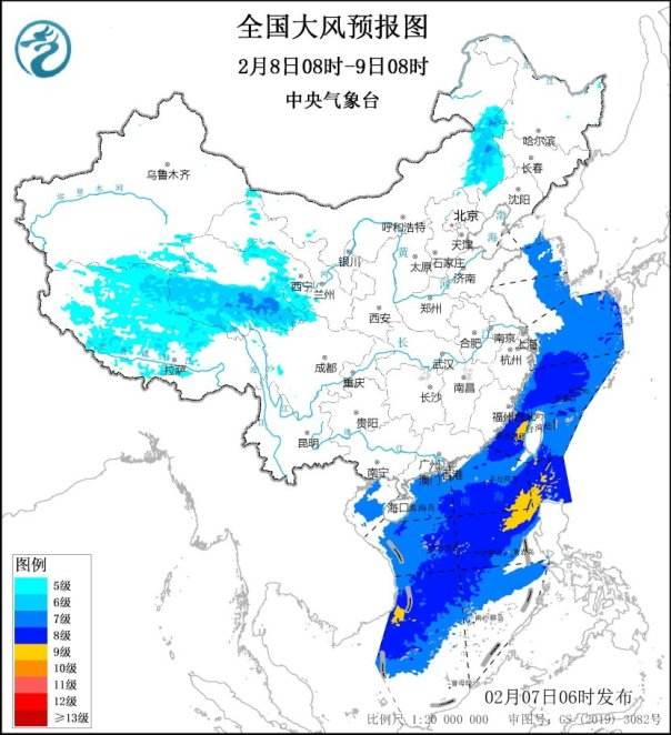 在冷高压控制下,7日北方地区风力仍然较大,长江中下游以北大部地区有5~6级、阵风7~8级的偏北大风,其中,内蒙古东部、华北北部、山东等地的部分地区最大阵风可达9~10级;渤海海峡、黄海中部、台湾海峡、巴士海峡、南海东北部和中东部的部分海域风力可达9级、阵风10~11级。8日,陆地大风明显减弱,南部海域风力较大。