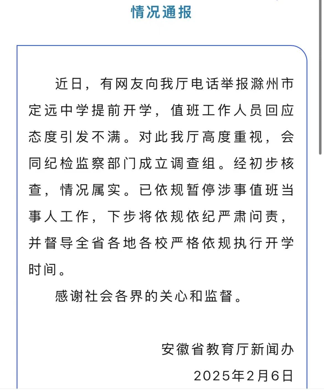 2月6日,安徽省教育厅新闻办发布情况通报称,对此,安徽省教育厅已会同相关部门成立调查组。经初步核查,情况属实。已依规暂停涉事值班当事人工作,下步将依规依纪严肃问责,并督导全省各地各校严格依规执行开学时间。