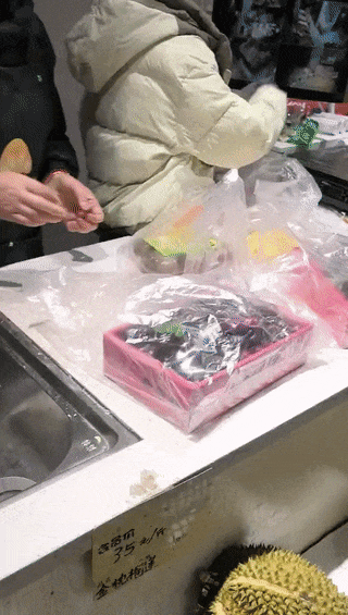 2J车厘子是新鲜海运到货的,目前售价5斤280元,也就是56元/斤,老板称要是一周前去买,可远远不止这个价,那时候空运车厘子还是主角,2J的5斤装卖三百多是最少的,如今一斤差不多便宜了10块钱。