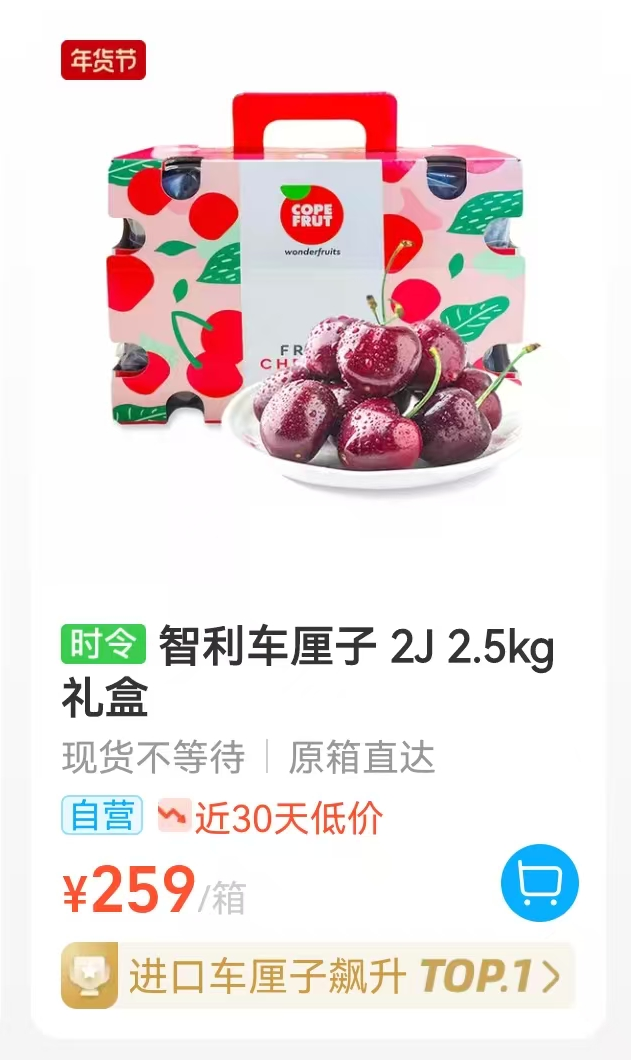 2J 五斤装车厘子259元,折合51.8元/斤,跟刚上市时的119.8元/斤比也是对半砍了。