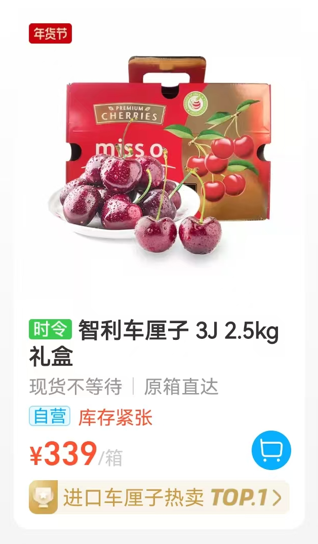 4J车厘子目前还是空运的,价格要稍微高一些,但也远没有上市时的天价了。目前5斤装4J车厘子售价330元,折合66元/斤,差不多是当初2J的价格。