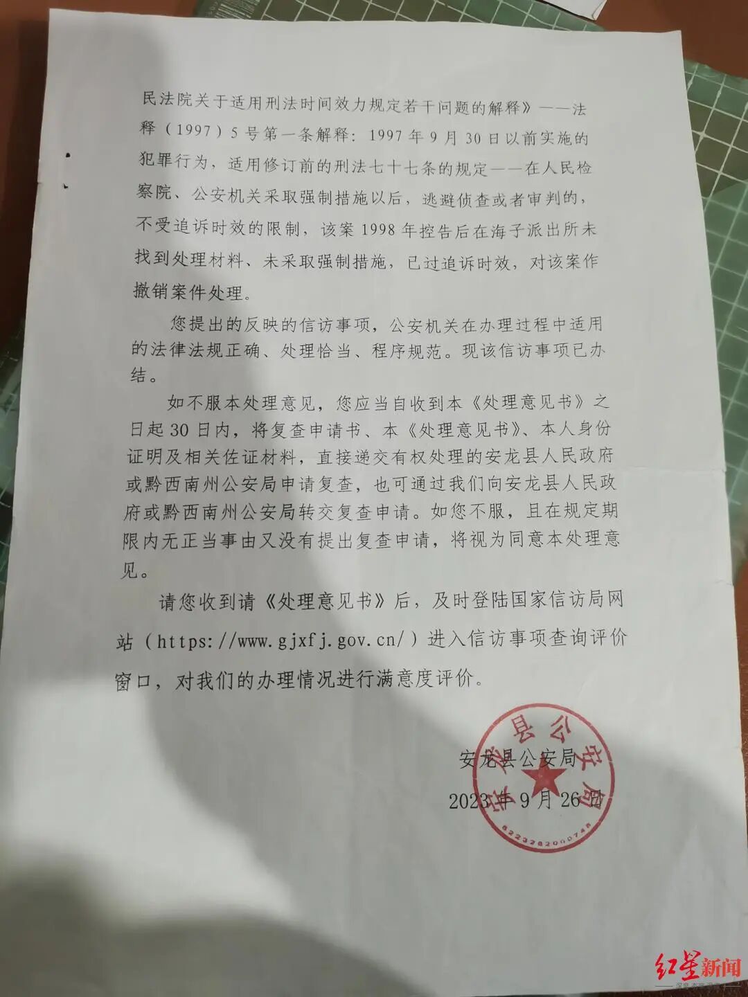 12月24日,红星新闻记者致电贵州省安龙县人民检察院。接线工作人员表示,就这一案件而言,“我们这边是已经办理结束了的,并且给到她答复。我们举行了公开听证会,然后也对她进行了检察长接访,释法说理。”