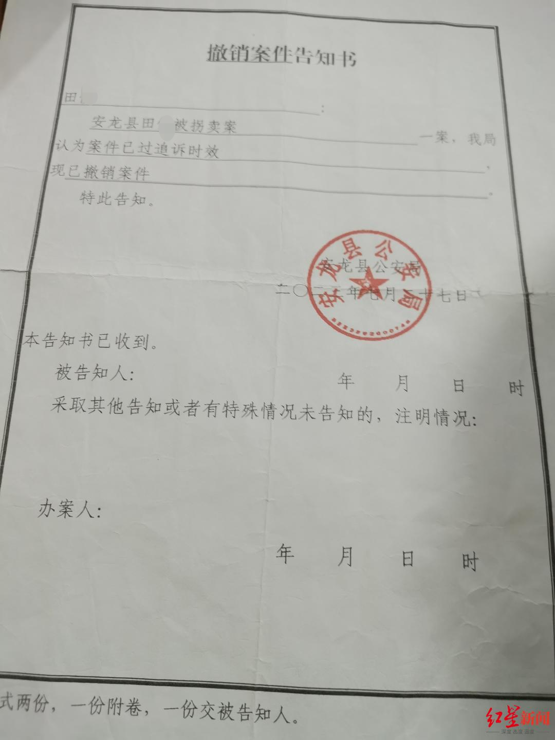 她向记者提供的落款时间为2023年的《撤销案件告知书》显示,安龙县公安局称其被拐卖一案已过追诉时效,现已撤销案件。田女士称,之后她便向当地检察院申请了立案监督。