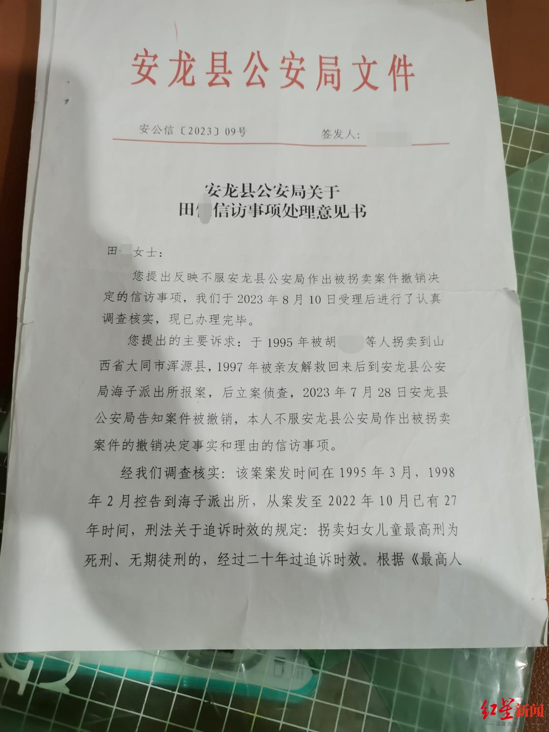田女士提供的另一份《安龙县公安局关于田某信访事项处理意见书》显示,经安龙县公安局调查核实,该案案发时间是1995年3月,1998年2月控告到海子派出所,从案发至2022年10月已有27年时间,刑法关于追诉时效的规定:拐卖妇女儿童最高刑为死刑、无期徒刑的,“经(或为‘已’)过二十年过追诉时效”。