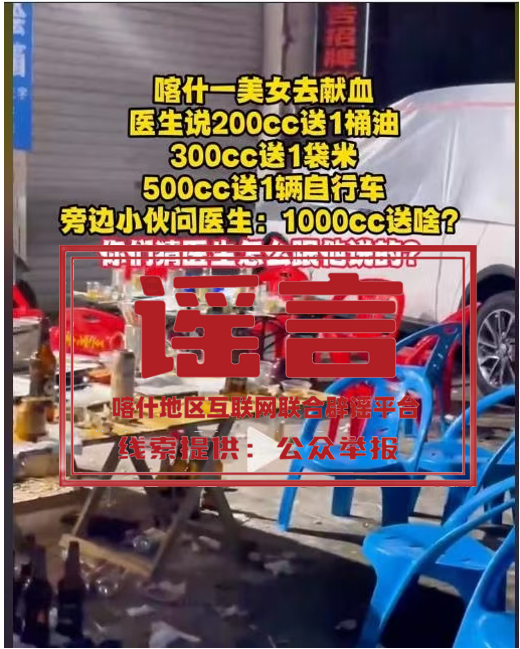 近日,有网民在互联网平台编造谣言信息称:“喀什献血200cc送1桶油,300cc送1袋米,500cc送1辆自行车”。经喀什地区血站核实,该网民发布内容为不实信息。