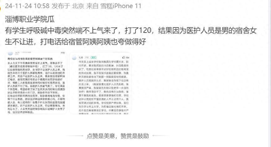 11月24日,疑似淄博职业学院当事女生发微博反映自己在宿舍楼发病救治遇阻。