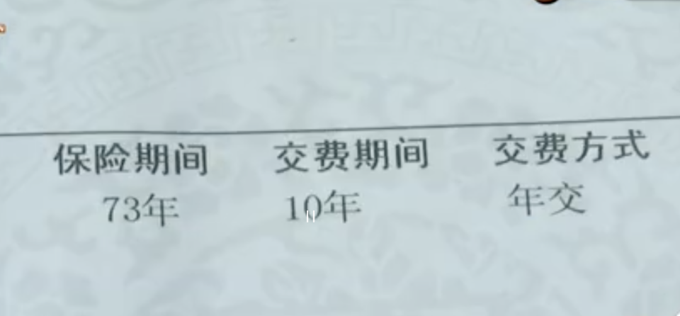 张女士提供的保险单显示,“保险期间”为73年,“交费期间”为10年,交费方式为年交。保险责任约定,被保险人在本合同保险期间届满日生存的,公司按本合同保险金额的300%给付满期保险金,本合同终止。