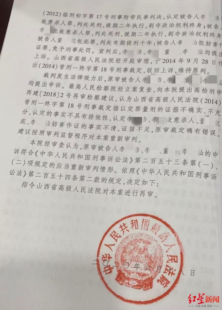 2020年6月,最高人民法院作出再审决定,指令山西省高院再审此案。最高人民法院认为,该案符合《刑事诉讼法》规定的应当重新审判的情形,指令山西省高级人民法院对该案再审。
